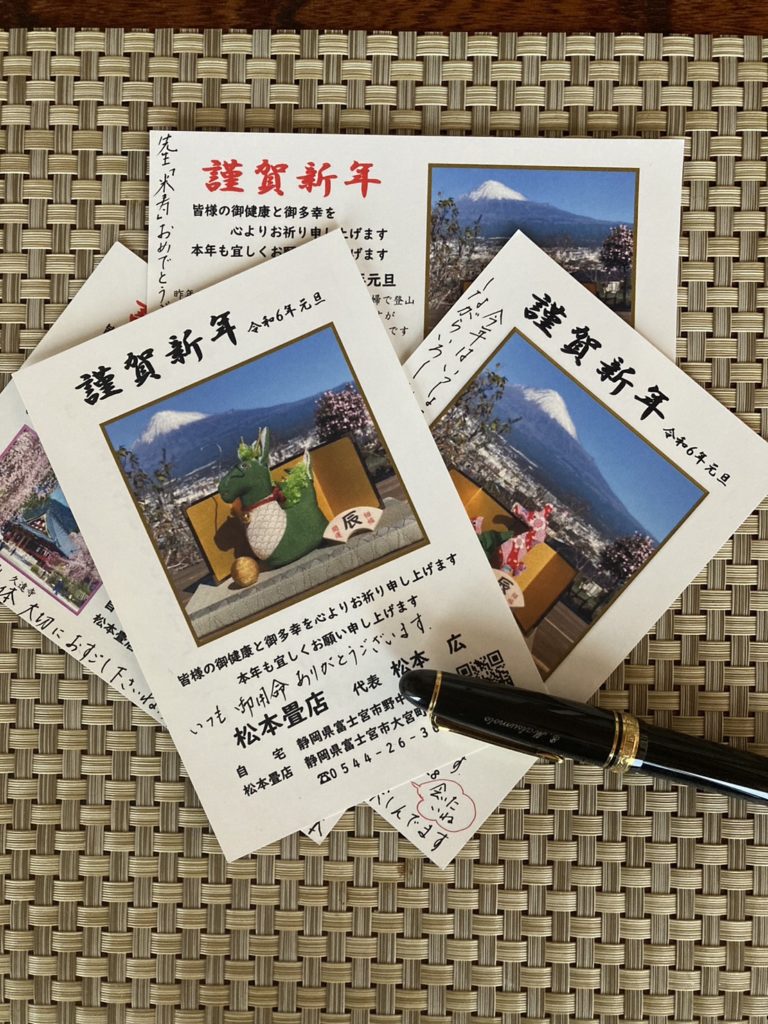 年賀状担当の畳屋女房です。4種類の年賀状を作り本日完成いたしました。今年は当店のホームぺージのQRコードも付けてみました。以前、書道の先生から「年賀状1枚1枚にも心を乗せなさい」と指導を受けました。両面印刷ですが170枚全てに手書きで一言添えました。市内・県内を始め福島・茨城・千葉・東京・神奈川・愛知・山梨・岐阜・京都・愛媛・兵庫・三重へ・・我が家から全国各地に届けられます。63円で日本各地に自分達の代わりに新年のご挨拶…私はこのような日本の文化が大好きです。