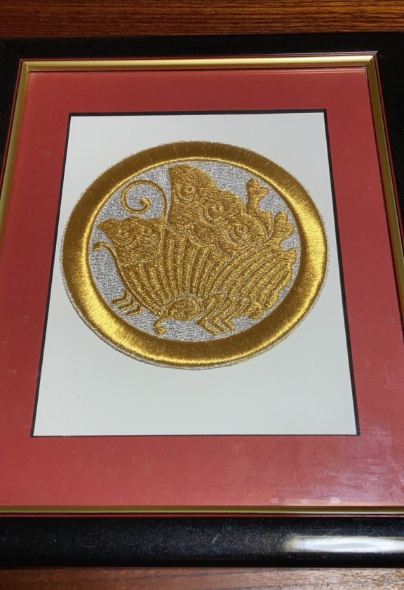 畳屋女房です。「丸に揚羽の蝶」は当店のロゴマークでもあり我が家の家紋でもあります。写真の金糸で刺繍された揚羽の蝶は先代が京都の刺繍専門店で偶然、見つけ購入してきたもです。どしっりと大きく高級感があります。代々遡るとこの家紋の家は、どうも平家一族のようです⁈