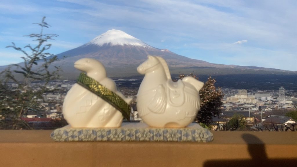 毎年、陶芸家の先生より干支の置物をいただいております。畳のへりが駅伝のタスキです。あと数時間で2025年の蛇さんから2026年の馬さんに畳のヘリのタスキが渡ります。