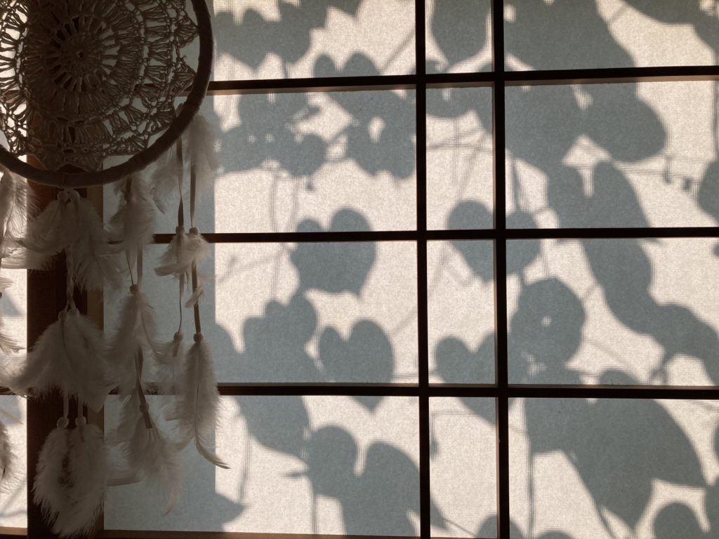 我が家の居間の障子です。東向きなので、太陽の優しい光と朝顔の影で朝から癒されます。ハート♡でいっぱいです。