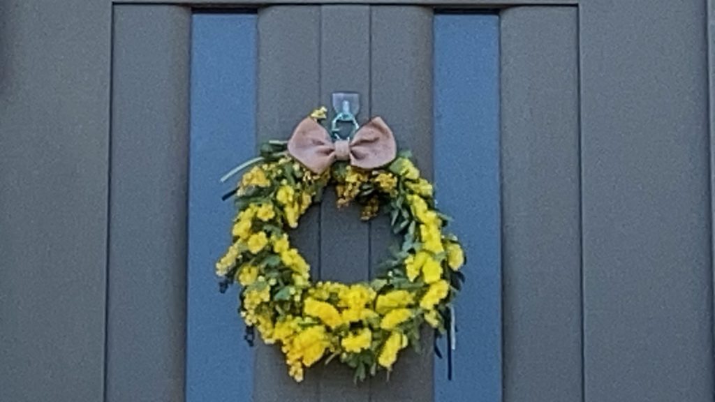 リースにしてみました。アクセントに畳の縁でリボンを作って付けてみました。