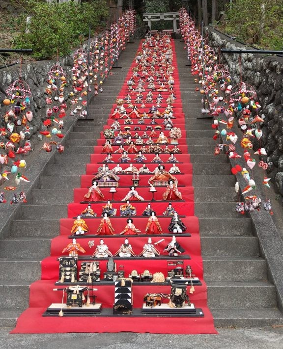 稲取の素戔嗚(スサノオ)神社の雛飾りです。両サイドには吊るし雛も飾られています。こちらのお賽銭箱も畳の上に置かれていました。
